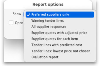 You might need to provide reports to a tender board, or for internal records. The tender module has several reports built in, accessed by clicking on the Print internal report button on the Items and compare prices tab of the tender details window. Clicking on the button displays this window with a drop down list of reports to choose from: