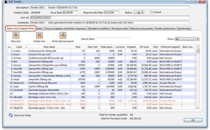 Here is an example of a tender that has been partially processed, looking at the Items and Compare prices tab: