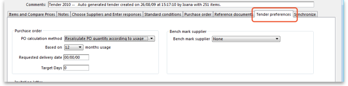 To set a benchmark supplier, open the tender (choose Suppler > Show Tenders… from the menus and double-click on the tender in the list) and on the Tender preferences tab, in the Benchmark supplier section select the desired benchmark supplier in the Benchmark supplier drop down list: