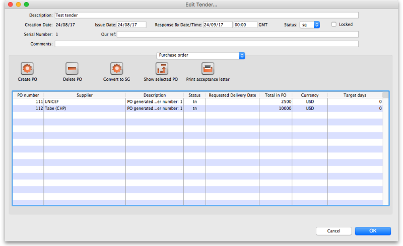 While a purchase order is being created and edited inside the tender module, it has the status of “tn” and isn't visible in the same way that purchase orders created outside the tender module are. Purchase orders that are visible in the main mSupply system have a status of “sg” (or “cn” or “fn”). Once you are satisfied with your purchase order in the tender module do this: