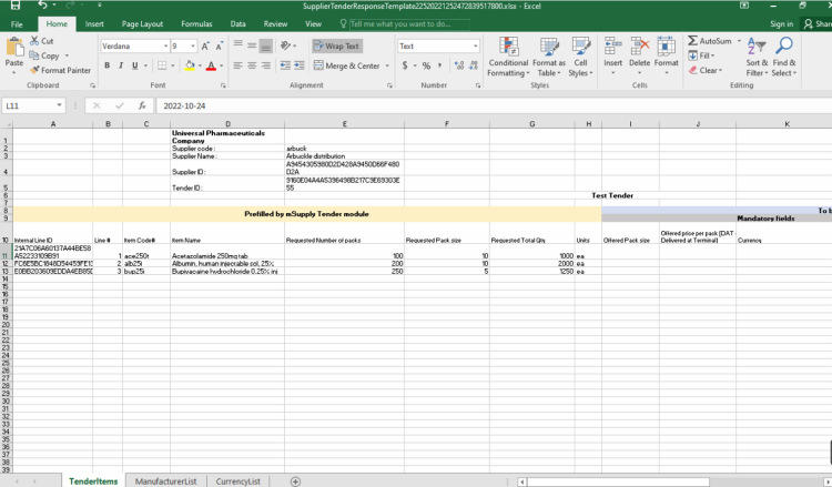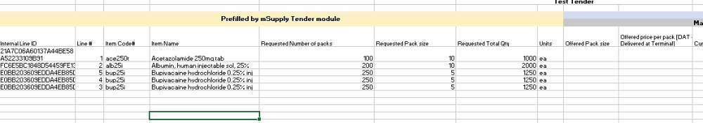 As a supplier, you may be invited to participate in a tender managed using mSupply. The client may send you a tender response template Excel document in xlsx format, which you are expected to complete and submit for evaluation. This allows the client to import bid responses from multiple suppliers, and easily compare them within the mSupply Tender Module.
