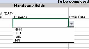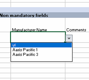 The currency and the manufacturer column should appear as a dropdown list. If this doesn't work, please make sure you are using Microsoft Excel and that the version supports xlsx file format.