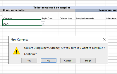 The example above shows Canadian Dollars (CAD) is being quoted for this item. Excel will alert you that this is a new currency. Click OK to continue with the new currency.