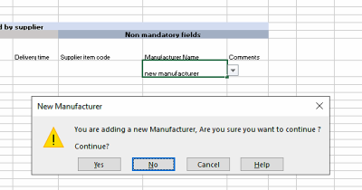 If the required manufacturer is missing, it means the client has never recorded goods from this manufacturer in mSupply before. You may enter the new manufacturer in this column. Excel will alert you that this is a new manufacturer. Click OK to continue with the new manufacturer.