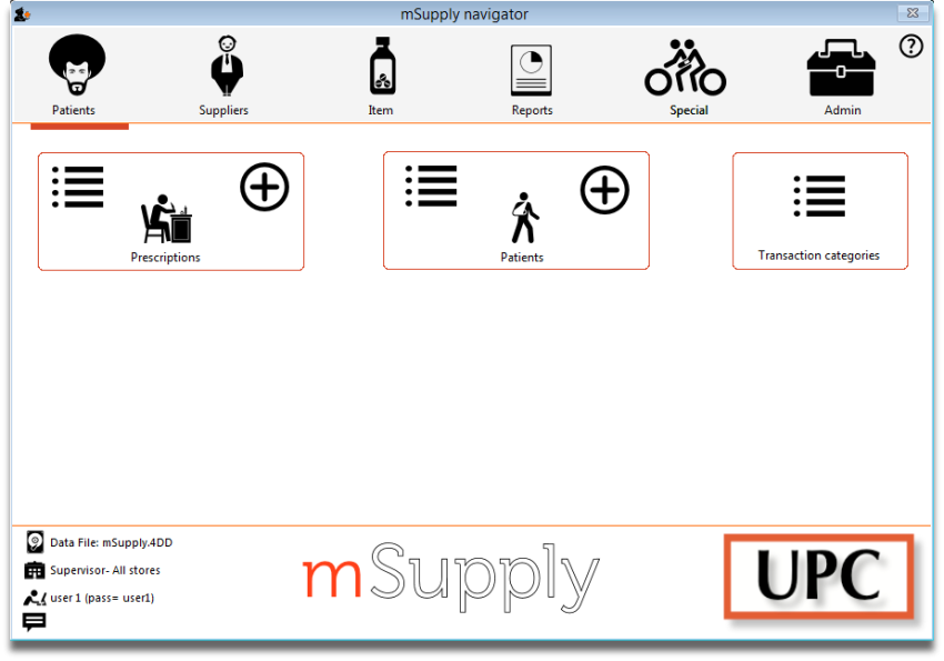 Immediately below this, there are six large icons, Customers or Patients, Suppliers, Item, Reports, Special and Admin. When you click on one of these large icons, the panel below will display more icons for each of the available functions and procedures. You can select the smaller panel icons by clicking on the icon, or by advancing through the icons with the right and left arrow keys and pressing Enter.