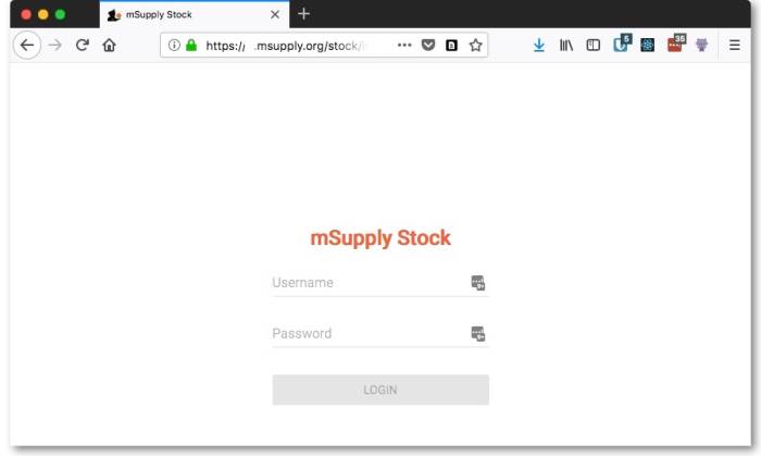 To access the Stock web app, point your browser to https://yourserver.msupply.org:2048/stock where yourserver.msupply.org is the domain name and 2048 is the port for your mSupply web server (these details will be supplied to you by Sustainable Solutions if you are using this functionality). If you are going to use the App a lot, it would be a good idea to set its location as a bookmark or favourite in your browser.