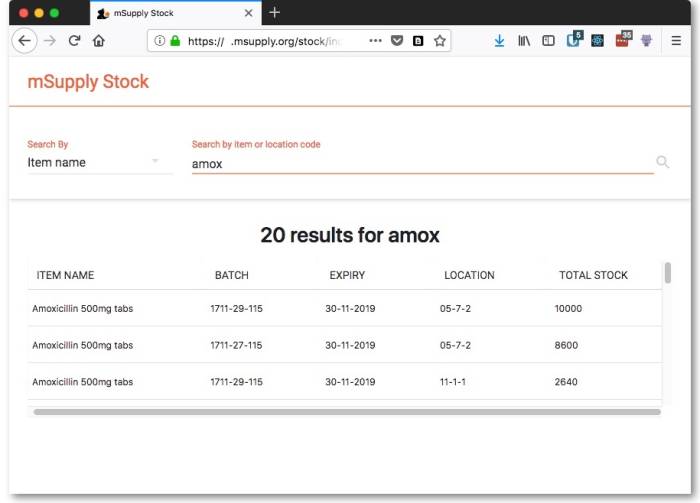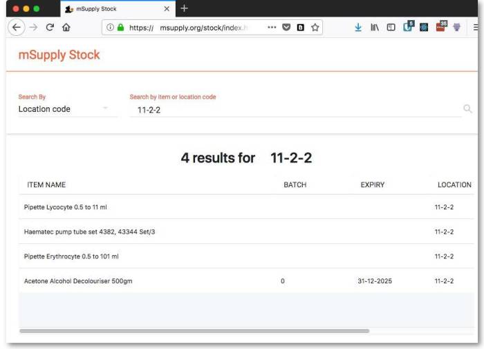 You can use the Stock web app to look up the stock on hand of items, including batch and expiry information, from anywhere you have access to the internet. Very handy if you are away from the computer you normally use to access mSupply, or travelling overseas and still need to check the stock information in your store.