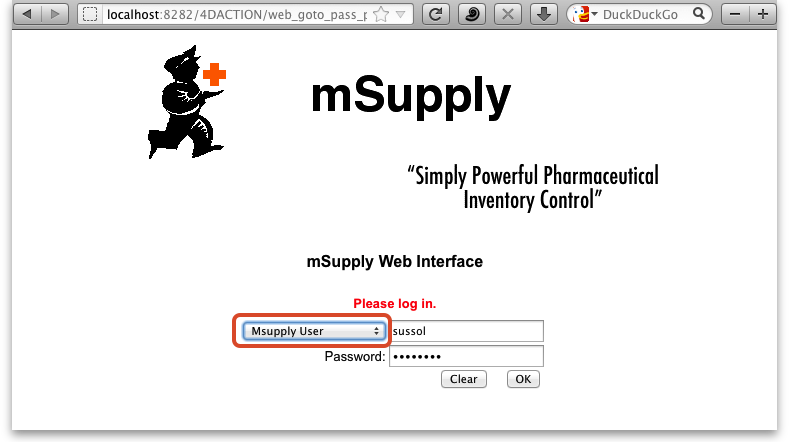 - When you log in you need to choose “mSupply user” and then enter the user name and password you use to login to the mSupply desktop application: