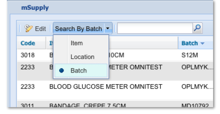 - Search for the item by typing the start of the item's name in the search box and clicking on the magnifying glass icon. Note that you can also search by location or batch the same way. Simply click on the Search By Item button and click on location or batch, as shown in the screenshot below: