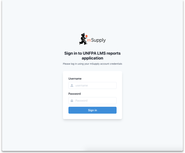 To login enter your mSupply username and password in the Username and Password fields and click on the Sign in button.