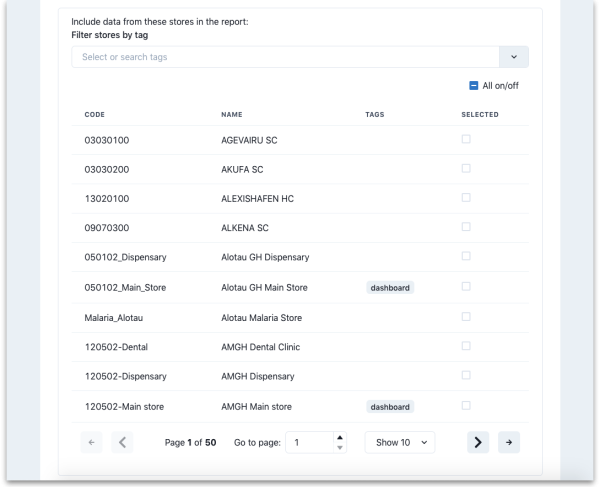Click on the SELECTED column checkbox to select a store to include in the report. You can click on the All on/off checkbox to toggle the SELECTED checkbox on and off for all stores on all pages at once. Only transactions and stock from the stores that have a check in the SELECTED checkbox will be included in the report.